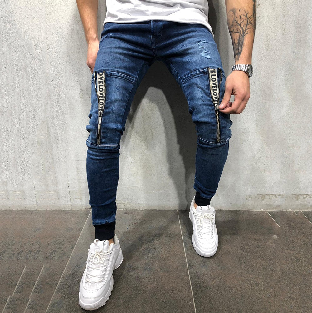 Vintage Ripped Jeans Men Zipper Letter Print Skinny Denim Pants Classic Cowboy Hip Pop Slim Fit Destroyed Jeans Pencil Pants D40